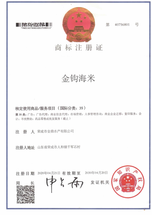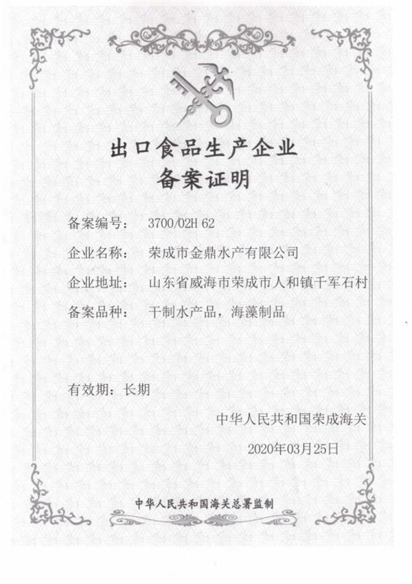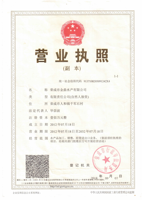 榮成市金鼎水產有限公司辦公地址位于東方好望角、亞細亞太陽啟升的威海,威海市榮成市人和鎮千軍石村,于2012年注冊成立,在公司發展壯大的8年里,我們始終為客戶提供好的產品、良好的技術支持,健全的售后服務。 查看詳情金鼎水產歡迎各界朋友蒞臨參觀指導和業務洽談!
